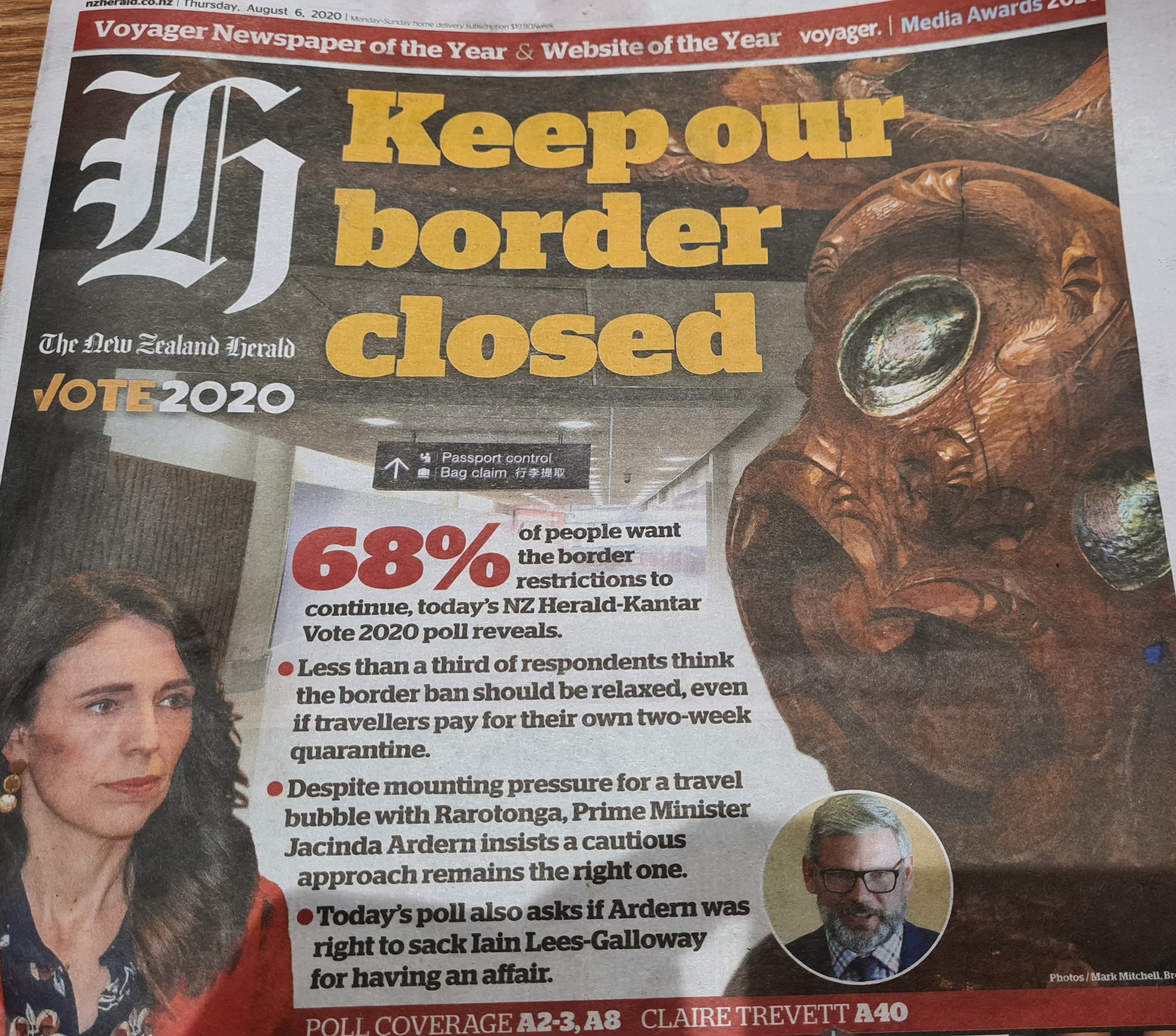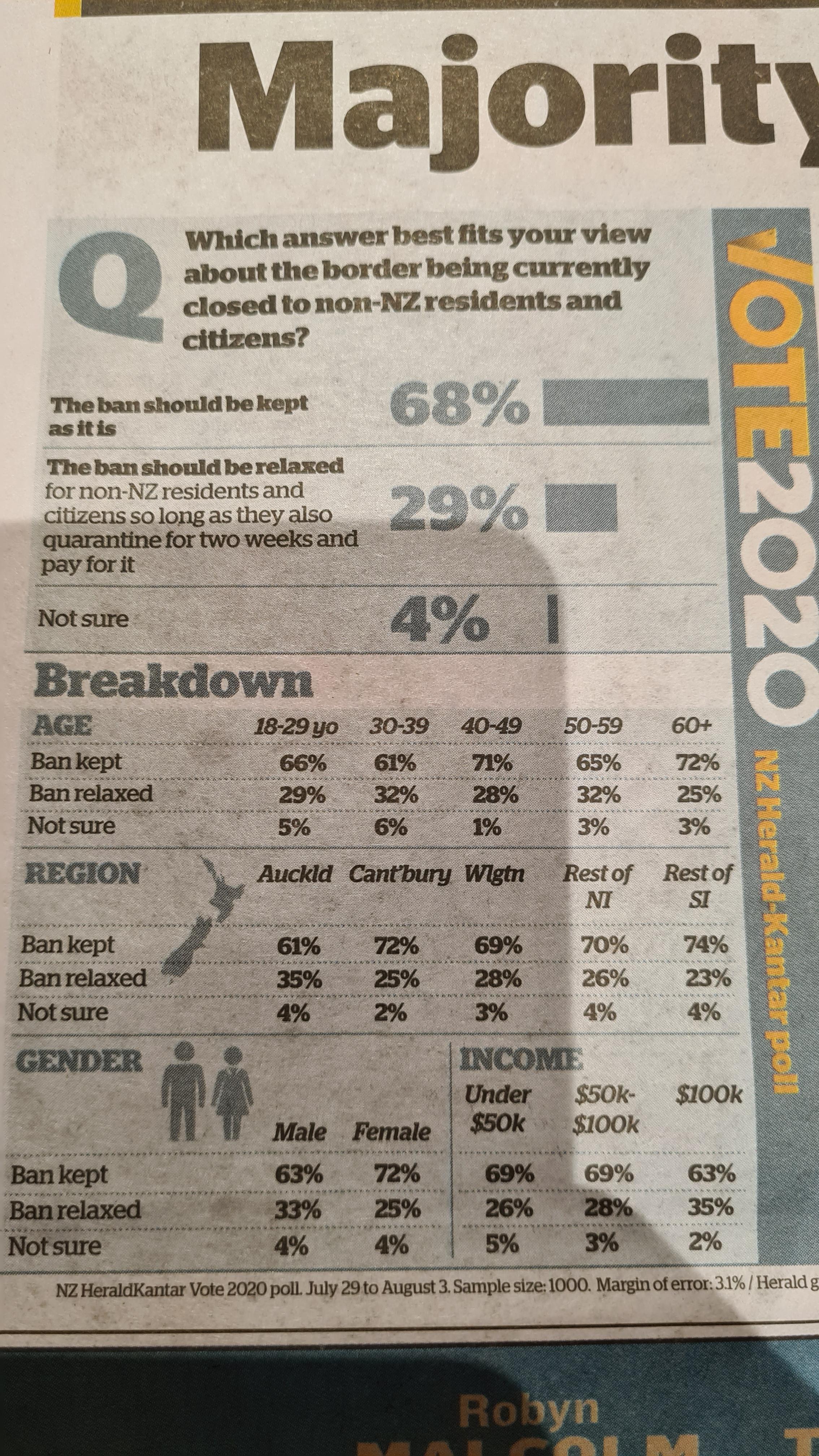 어제 신문에 난 여론조사 결과에 따르면 뉴질랜드인 68%가 코로나19 상황에서 국경통제를 계속 해야한다고 의견을 내놨다.