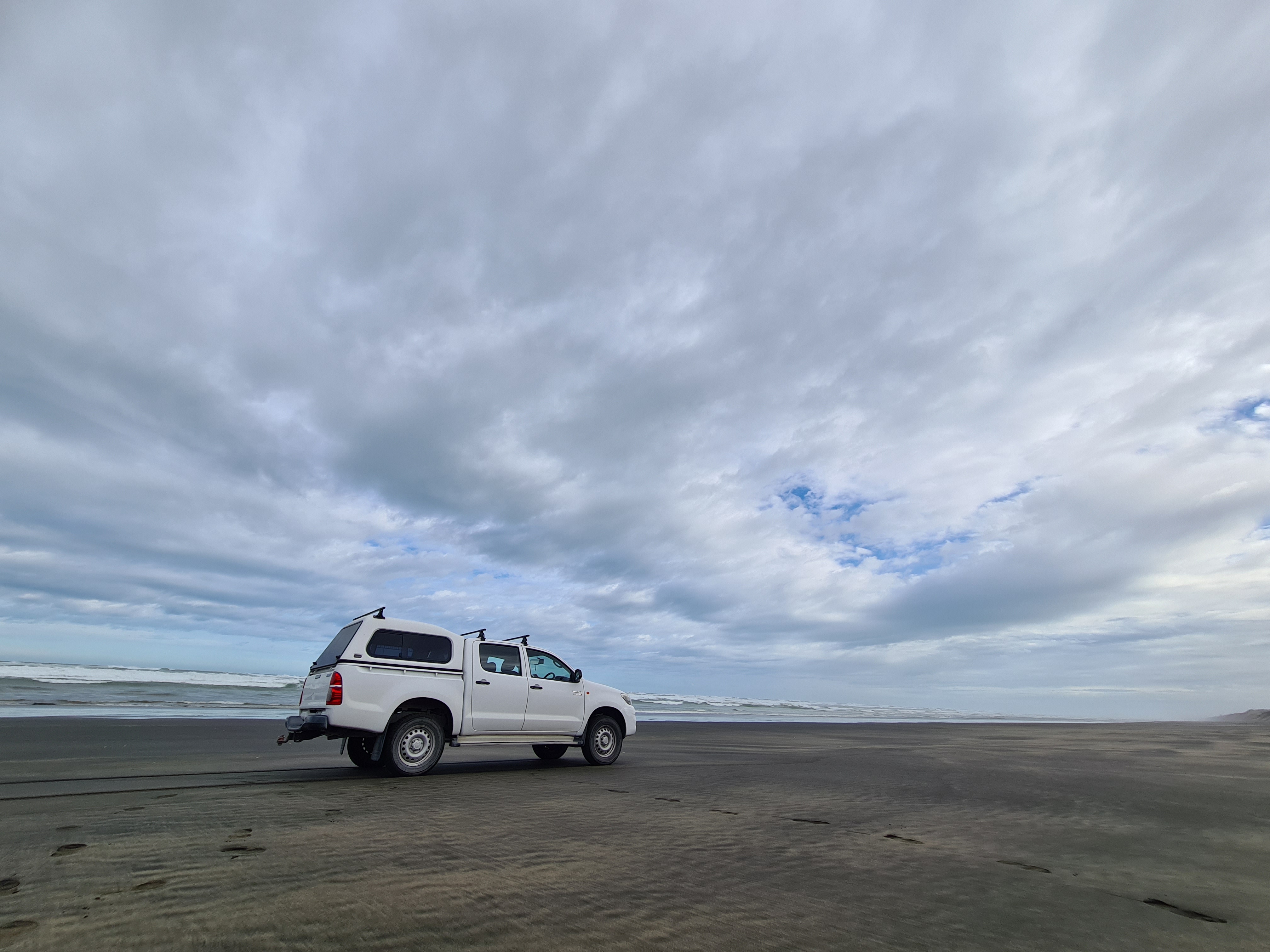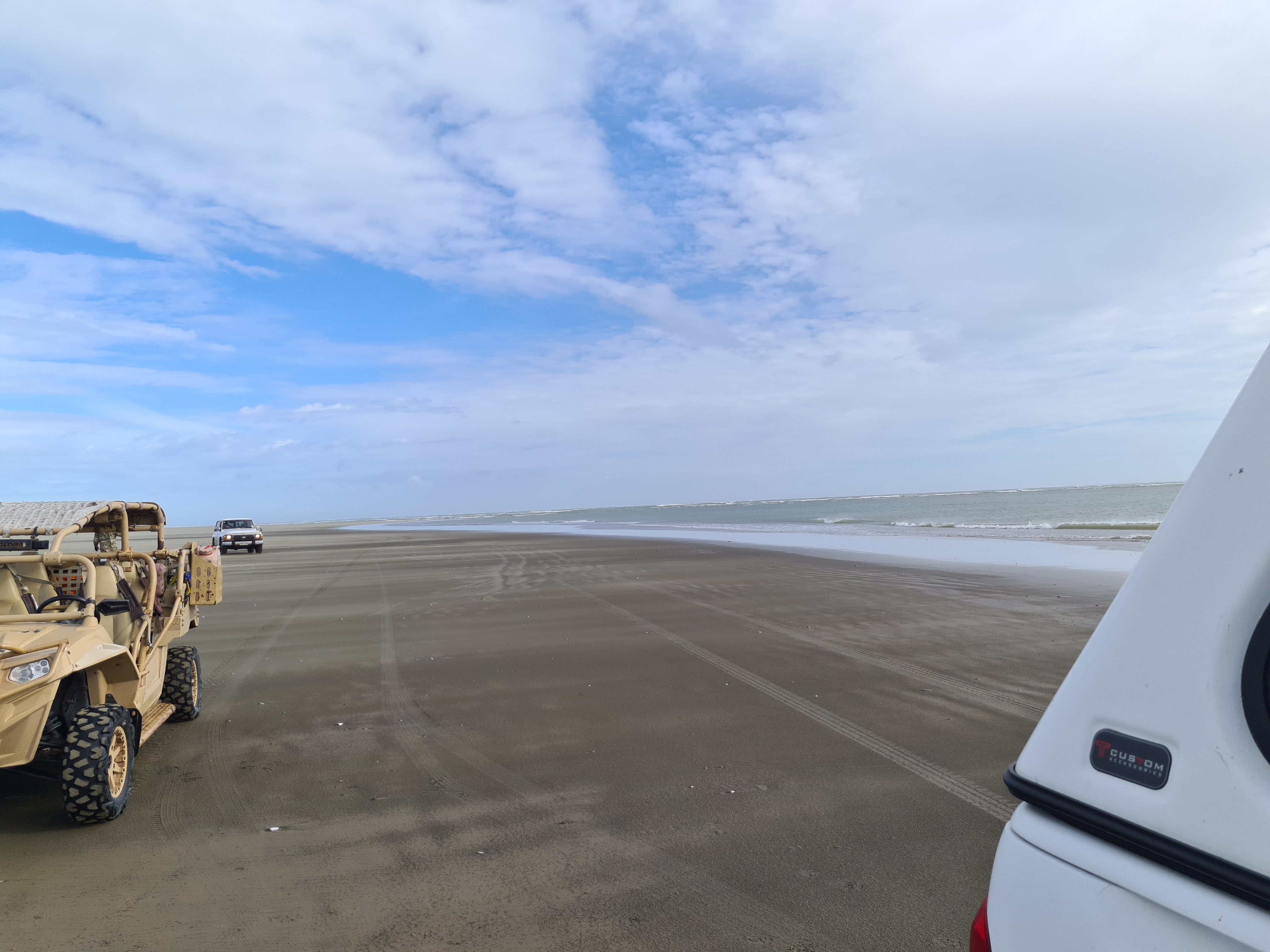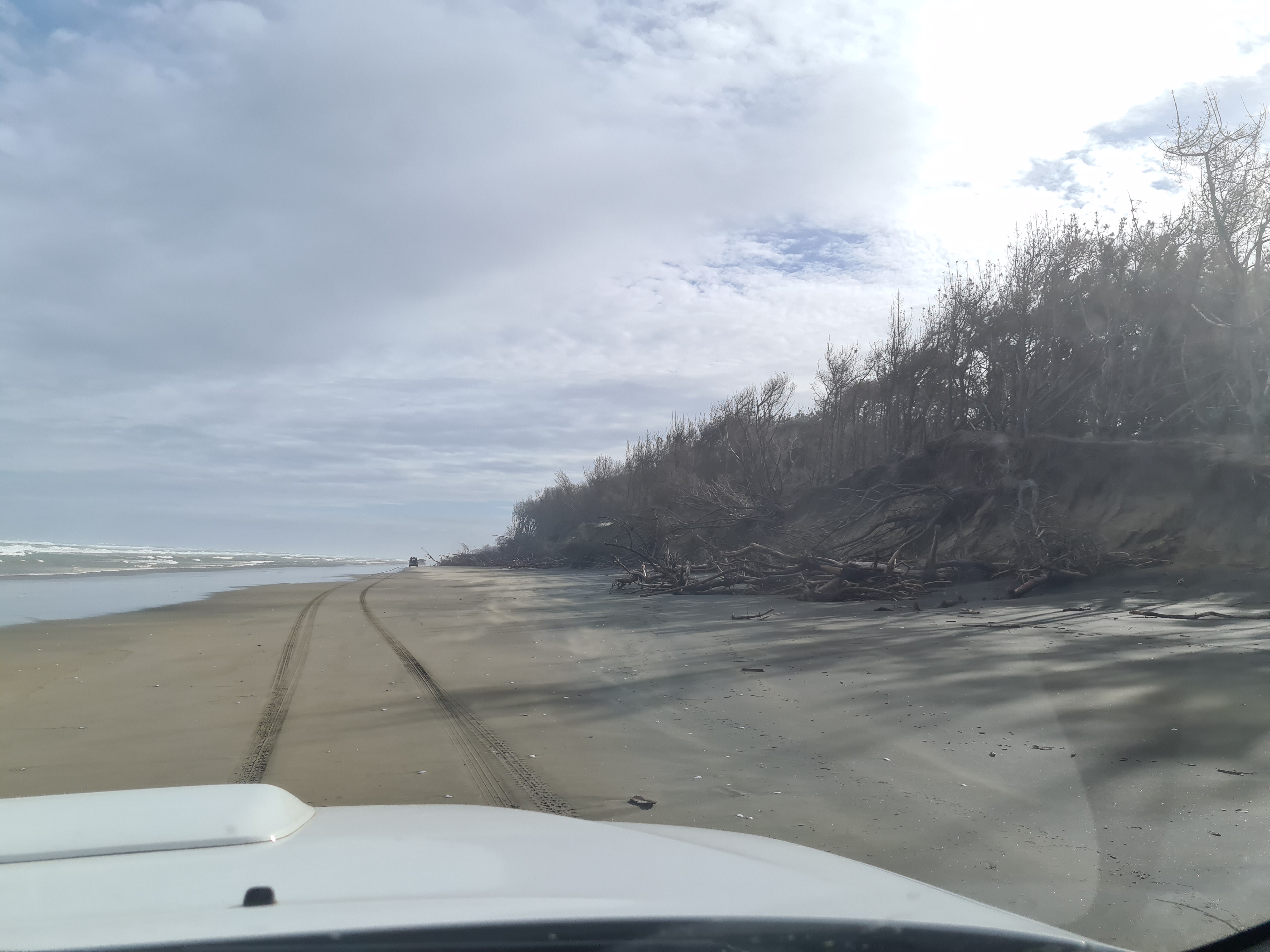 조금 터프한 길을 지난다. 4WD로 기어를 변경 한 후 기듯이 모래언덕을 넘어 비치로 들어갔다. 모래가 좀 무른 느낌이다. 계속 4WD 상태에서 4단으로 달리기 시작했다. 속도계를 보니 50Km 정도다. 이 상태로 10분정도 올라간 지점에서 자리를 잡을까 한다. 왼쪽으로 보이는 바다 상태가 좋지않다. 파도가 4-5미터는 되는듯.. 비치에 모래바람이 이는것을 보니 바람도 세다.