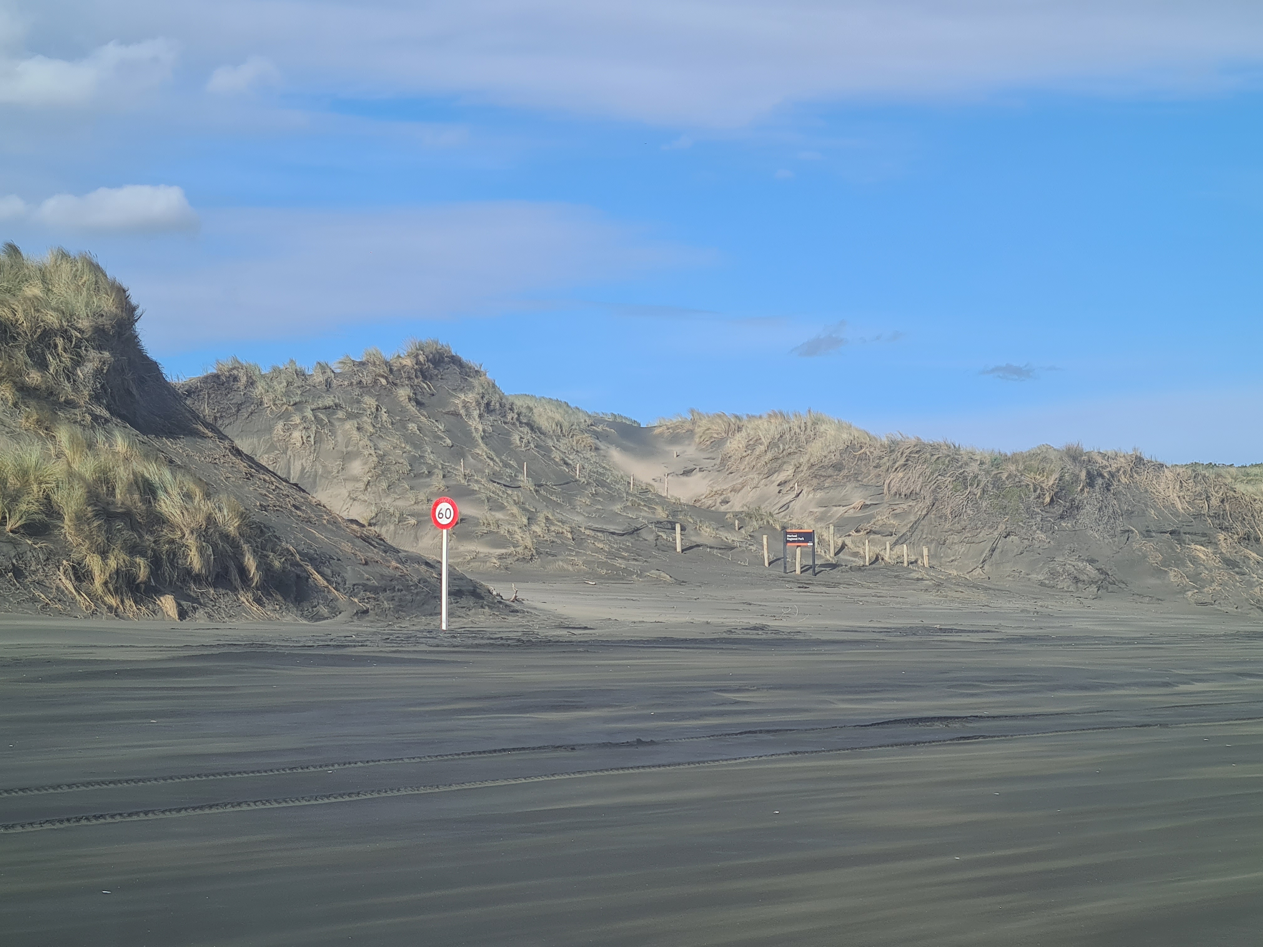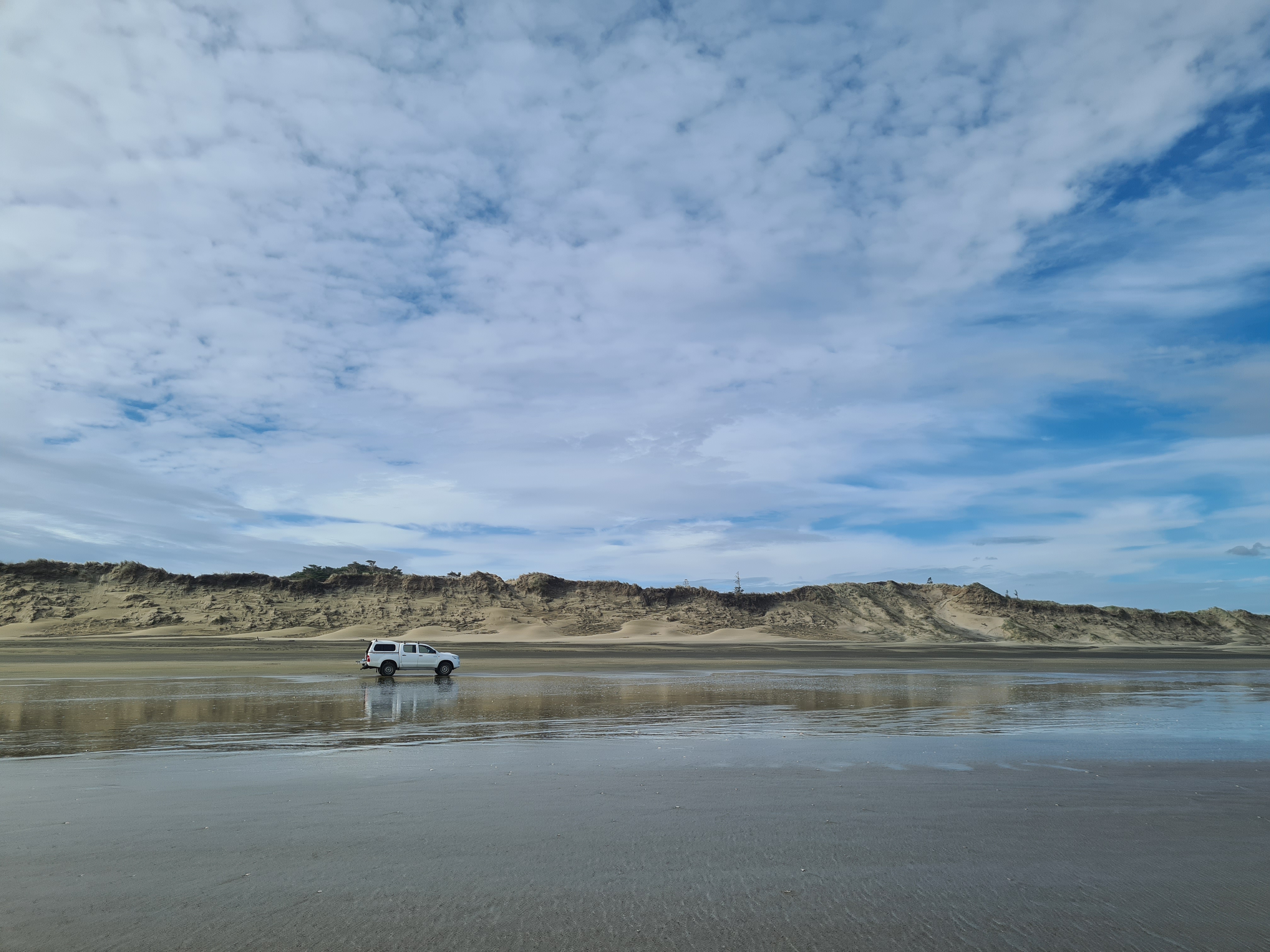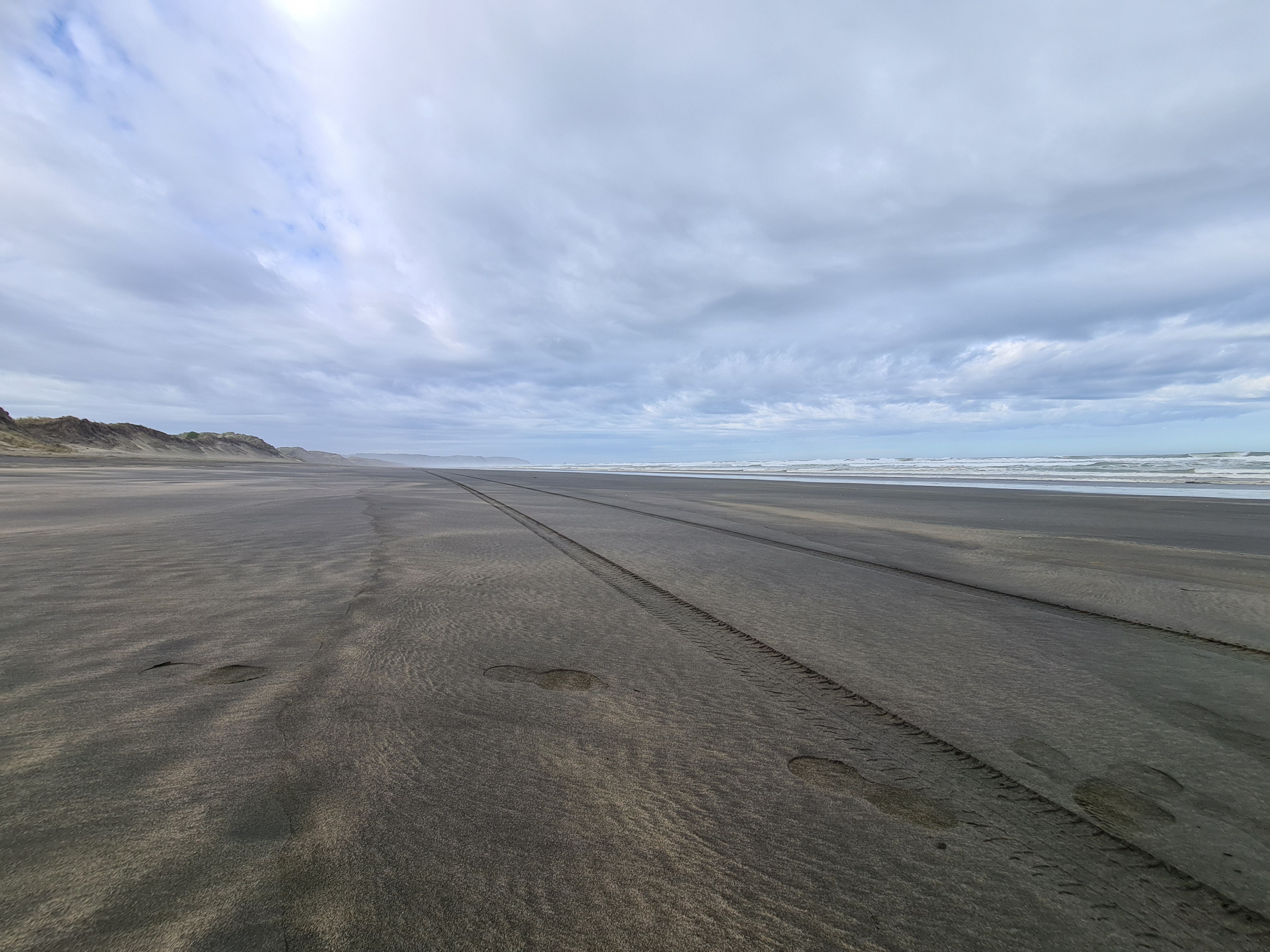 조금 터프한 길을 지난다. 4WD로 기어를 변경 한 후 기듯이 모래언덕을 넘어 비치로 들어갔다. 모래가 좀 무른 느낌이다. 계속 4WD 상태에서 4단으로 달리기 시작했다. 속도계를 보니 50Km 정도다. 이 상태로 10분정도 올라간 지점에서 자리를 잡을까 한다. 왼쪽으로 보이는 바다 상태가 좋지않다. 파도가 4-5미터는 되는듯.. 비치에 모래바람이 이는것을 보니 바람도 세다.