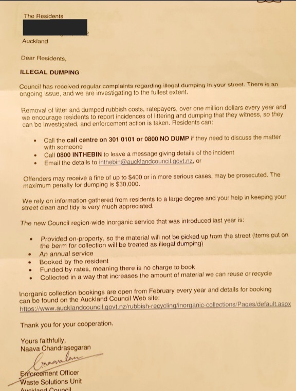 집에 돌아와 편지에 있는 전화번호로 전화 했더니 오클랜드 카운슬로 연결된다. 상담원에게 자초지정을 이야기 했더니 너희집 쓰레기 아니면 걱정 안해도 된다고 한다. 누군가 길거리 쓰레기를 신고하게 되면 그 주변 집들에게 모두 레터를 보내게 된다고 한다. 그러면 해당 되는 쓰레기 주인이 치울거라고... 그래서 14번지 쓰레기가 사라진 거였다. 벌금을 피하기 위해...