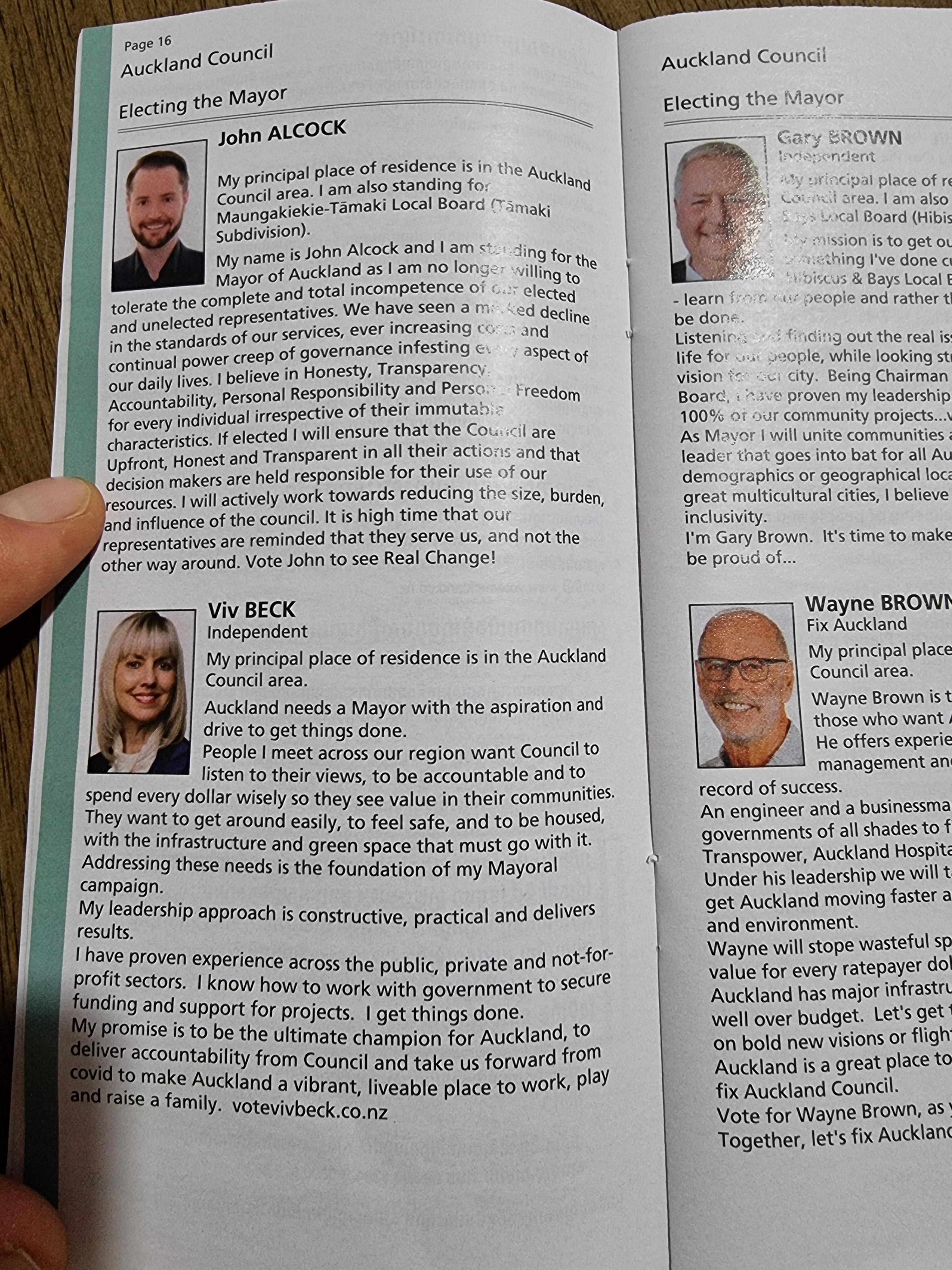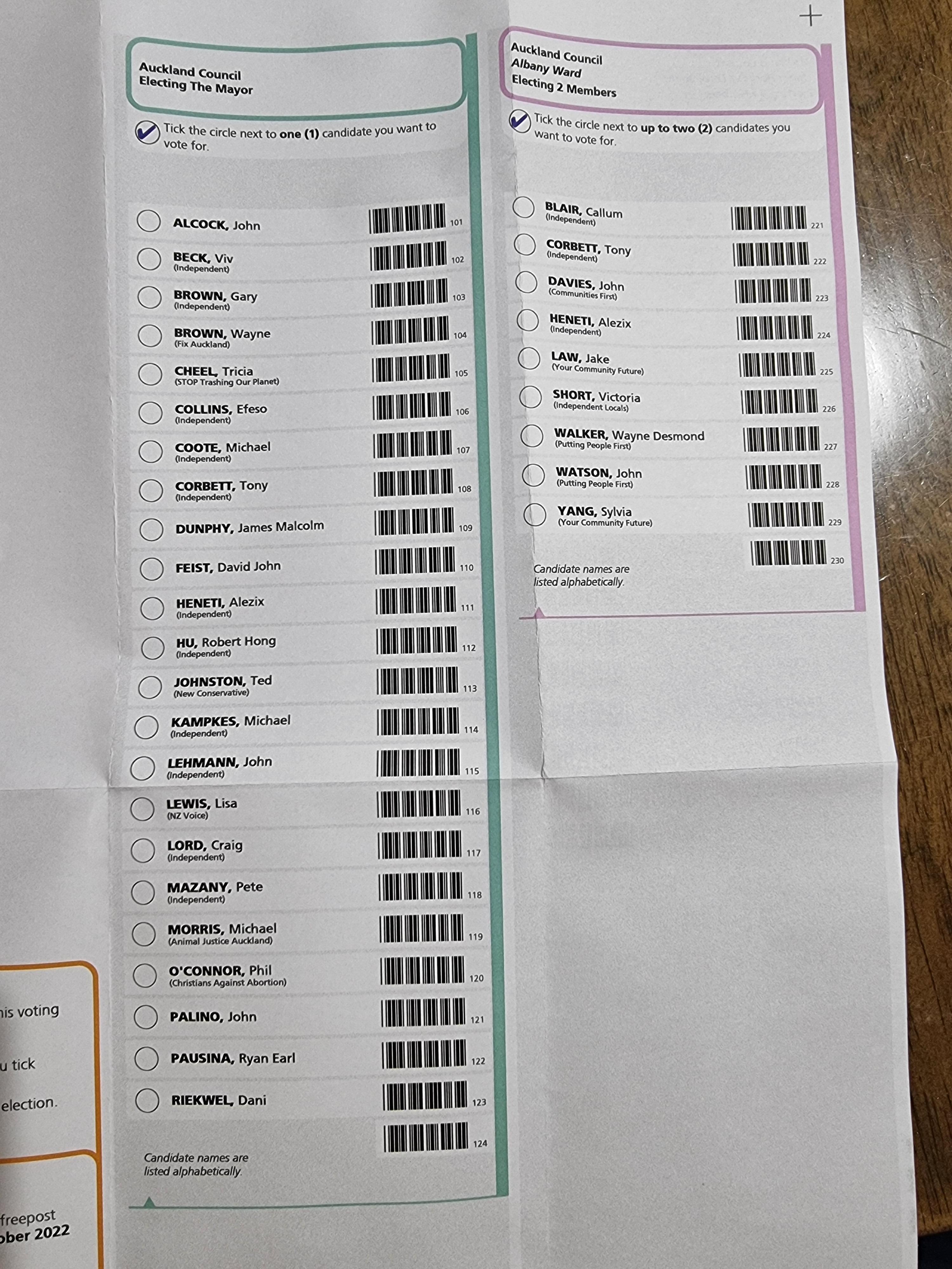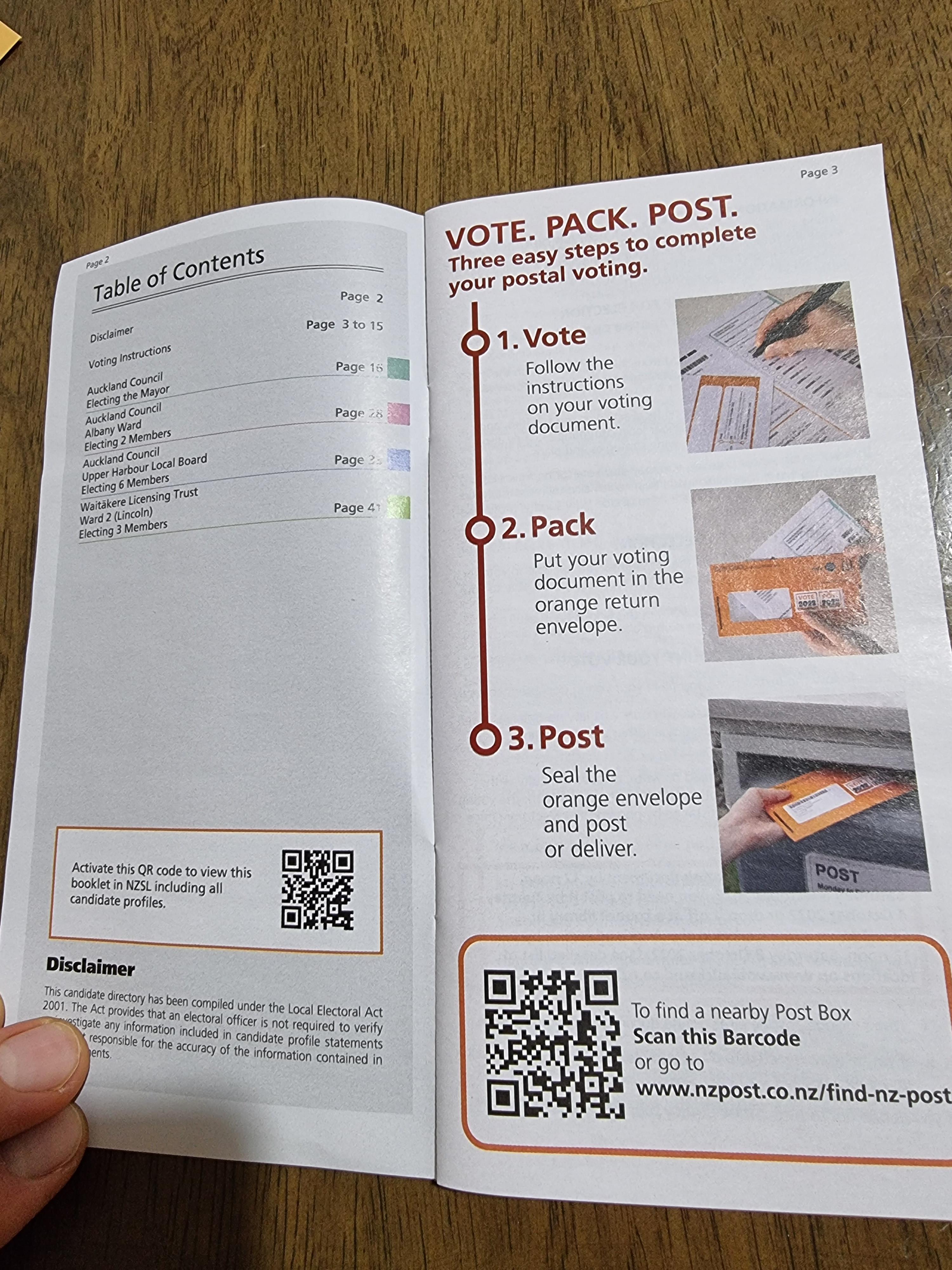 이번에는 3가지 투표를 해야 한다. 첫 번째는 오클랜드 시장, 두 번째는 시의원, 마지막으로 지역 의원이다. 투표용지도 후보자들 소개도 팸플릿도 심플하구나. 후보자 소개 팸플릿에는 13개 국가 언어로 투표에 대한 안내가 적혀있다. 뉴질랜드가 글로벌하다는 걸 실감하는 순간이기도 하고 나름 배려했다는 생각도 든다. 물론 한국어 안내문도 있다.