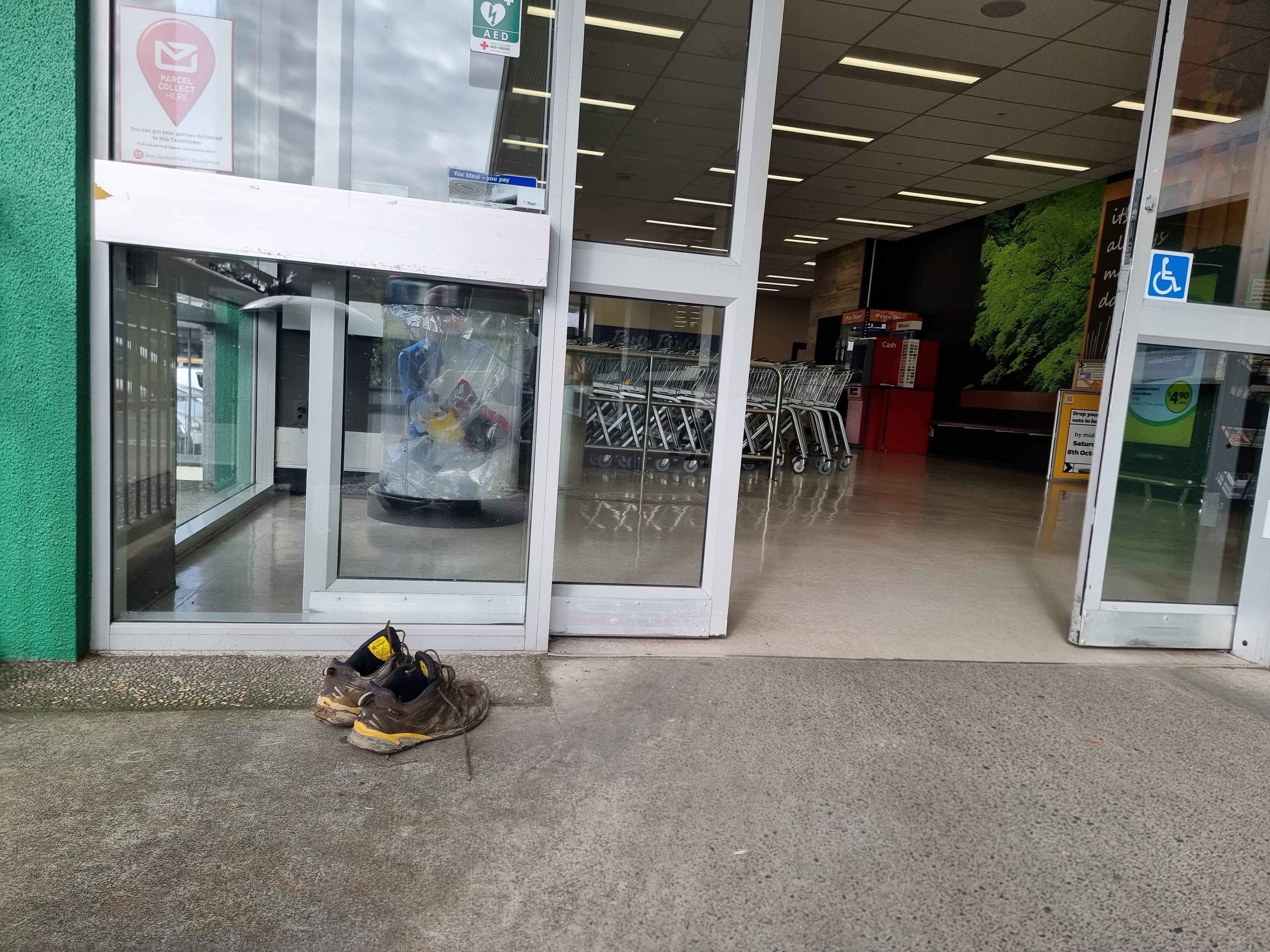 짐작컨데 이른 아침 쇼핑몰이 문 열릴 때 맞춰서 뭔가를 사러 온 손님이 벗어놓고 들어간 신발입니다. 사진 찍느라 보니 신발에 흙이 제법 묻어 있는 게, 이른 아침 잔디를 깎거나 가드닝을 하다가 온 것 같습니다. 자신이 신은 신발에서 떨어진 흙이 매장을 더럽힐까 봐 신발을 입구에서 대기시켜놓은 것입니다.