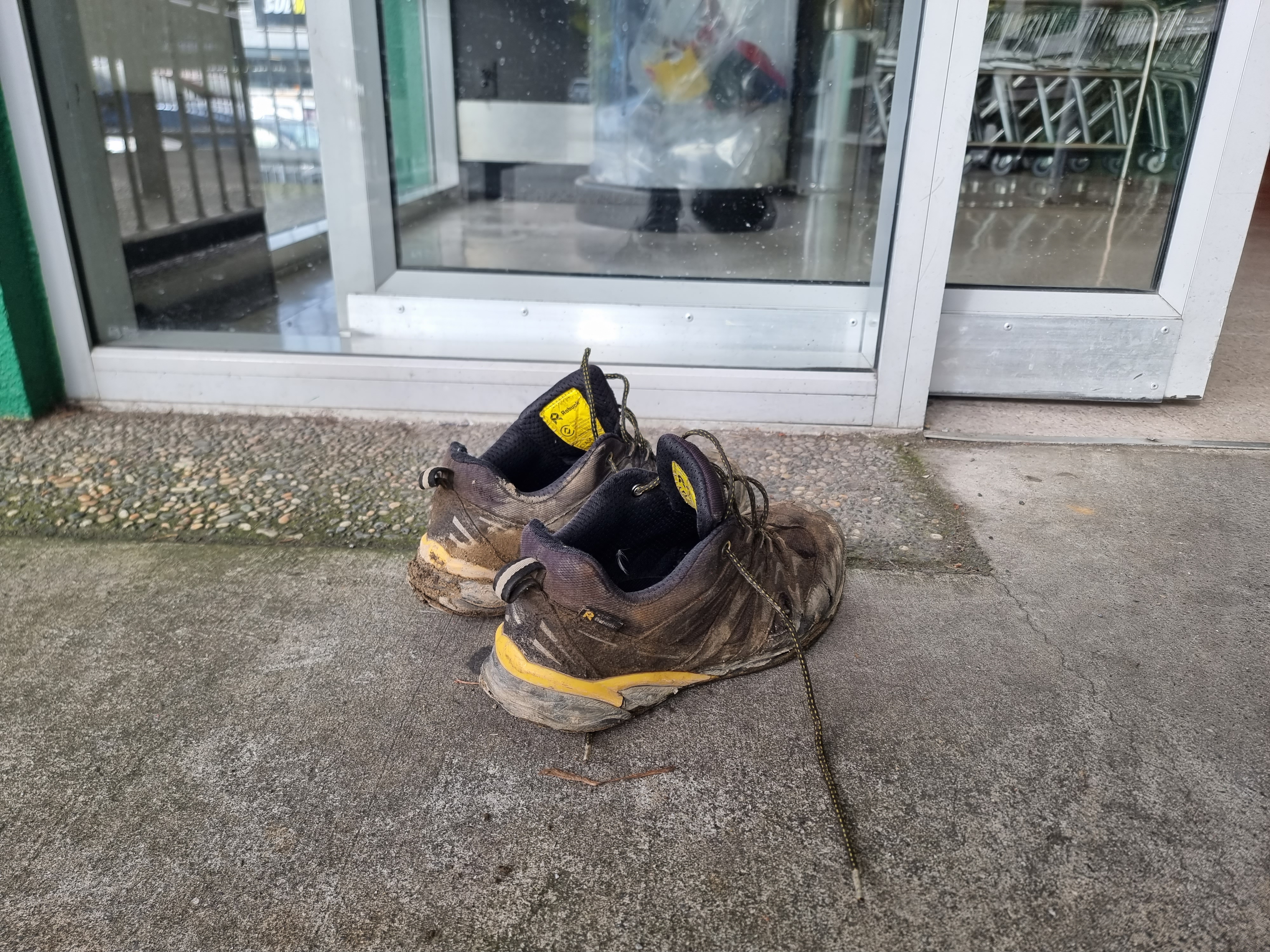 짐작컨데 이른 아침 쇼핑몰이 문 열릴 때 맞춰서 뭔가를 사러 온 손님이 벗어놓고 들어간 신발입니다. 사진 찍느라 보니 신발에 흙이 제법 묻어 있는 게, 이른 아침 잔디를 깎거나 가드닝을 하다가 온 것 같습니다. 자신이 신은 신발에서 떨어진 흙이 매장을 더럽힐까 봐 신발을 입구에서 대기시켜놓은 것입니다.