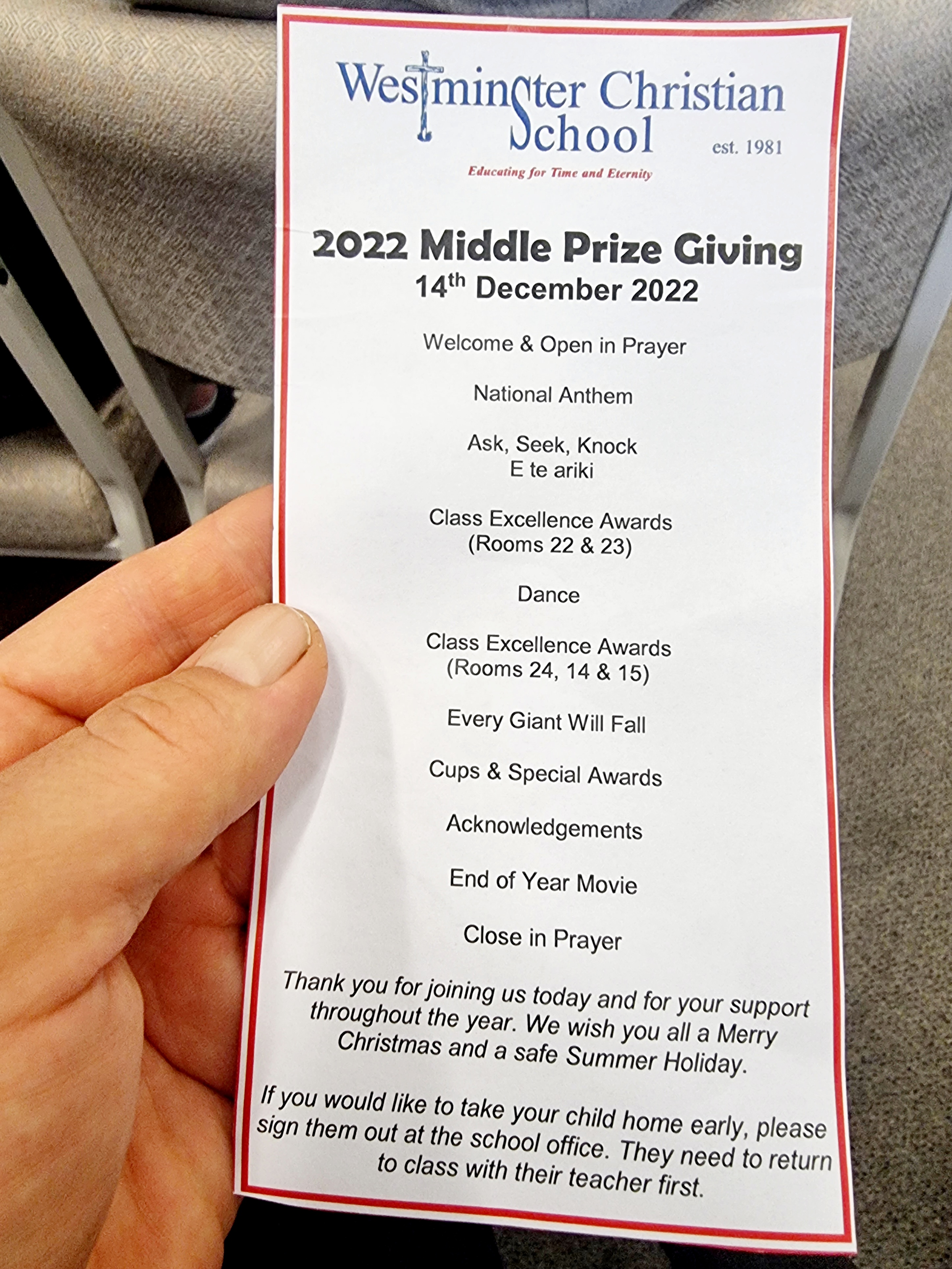 종강식은 아이들 대표가 사회를 보며 진행을 합니다. 기도 후 국가 제창이 이어지고, 곧바로 3학년 담임 선생님이 과목별 성적 우수 학생을 호명하면 무대에 올라가 교장선생님과 악수 후 담임 선생님께 상장을 받고 무대 앞에 섭니다. 공부를 잘하는 학생은 2-3과목에 걸쳐 우수상을 받기도 합니다. 학생들이 다 상장을 받으면 무대 앞에 나란히 서서 포토타임을 갖고 바로 그다음 반 시상.