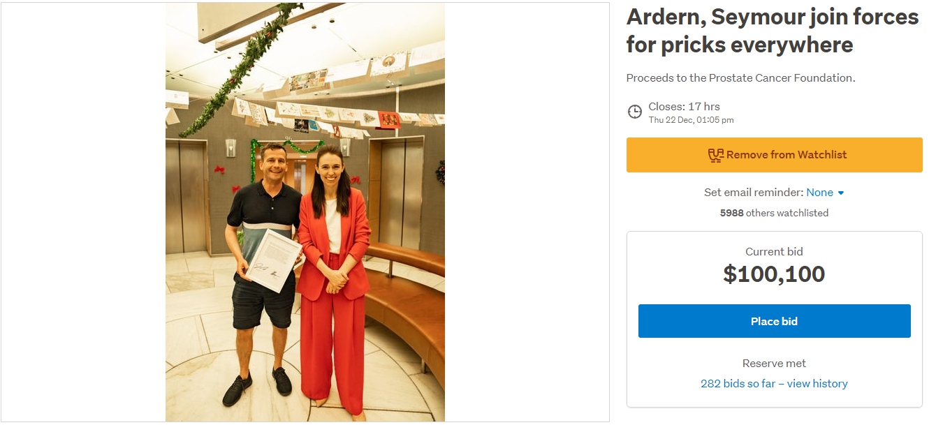 트레이드 경매에서 모금된 돈은 모두 '전립선암 재단'에 기부가 됩니다. 트레이드미 경매 페이지를 보니 아던 총리와 시모어 대표가 액자에 사인하는 각각의 사진과 액자 사진, 두 사람이 액자를 들고 있는 사진 등이 함께 올려져 있네요. 조금전 확인 해보니 입찰액이 10만불을 넘겼습니다. (오후8시 21일 12월 2022)