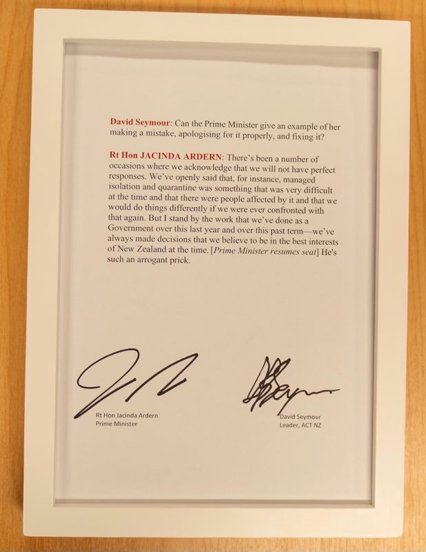 아던 총리가 야당인 액트당(ACT) 대표에게 던진 욕설 파문이 경매사이트로 훈훈하게 마무리되는 형국입니다. 지난 13일 날 국회에서 총리와 액트당 시모어 대표 간에 공방이 오가는 과정에서 시모어 대표가 계속 까다로운 질문을 던졌고 어렵게 답변을 마친 총리. 분을 삭이지 못하고 시모어 당대표를 겨냥해 혼잣말로 “건방진 놈”(Such an arrogant prick)이라고 중얼거렸는데, 이 발언이 마이크를 타고 국회에 울려 퍼졌습니다. @@