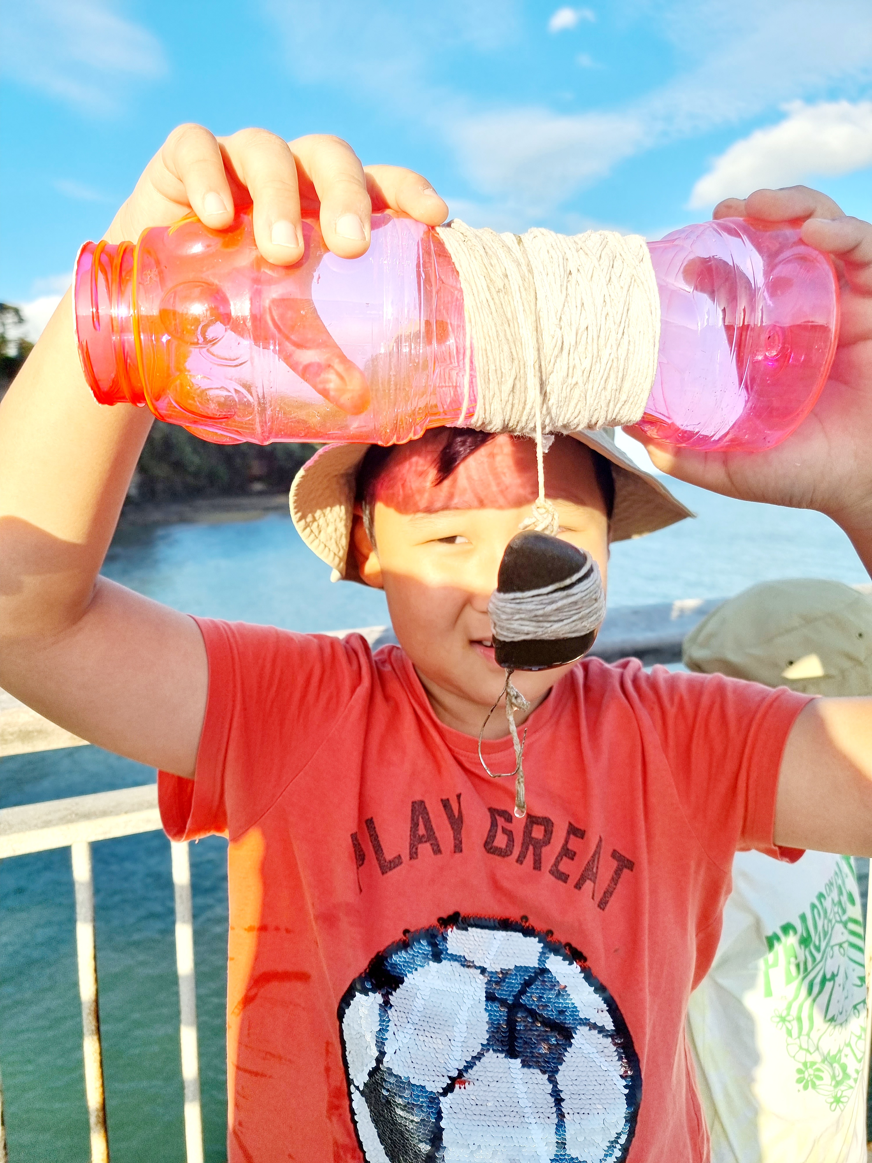 조심조심 와프 아래로 바늘과 추라고 묶어놓은 돌멩이를 내립니다. 다 내려가고 다민이가 물어봅니다. 아빠 언제 물어? 기다려봐... 1분도 안지나 보조로 열심인 다래가 물어봅니다. 얼마나 기다려야 돼? ㅡㅡ 낚시는 기다리는 거야라고 하니 '페이션트라고요?'