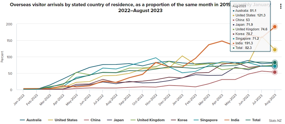 뉴질랜드를 오가는 국제 항공편 수의 증가도 여행 수요의 반등을 반영하고 있는데, 2023년 8월에는 2,800편의 항공편이 도착했다.(2022년 8월에는 1,900편)