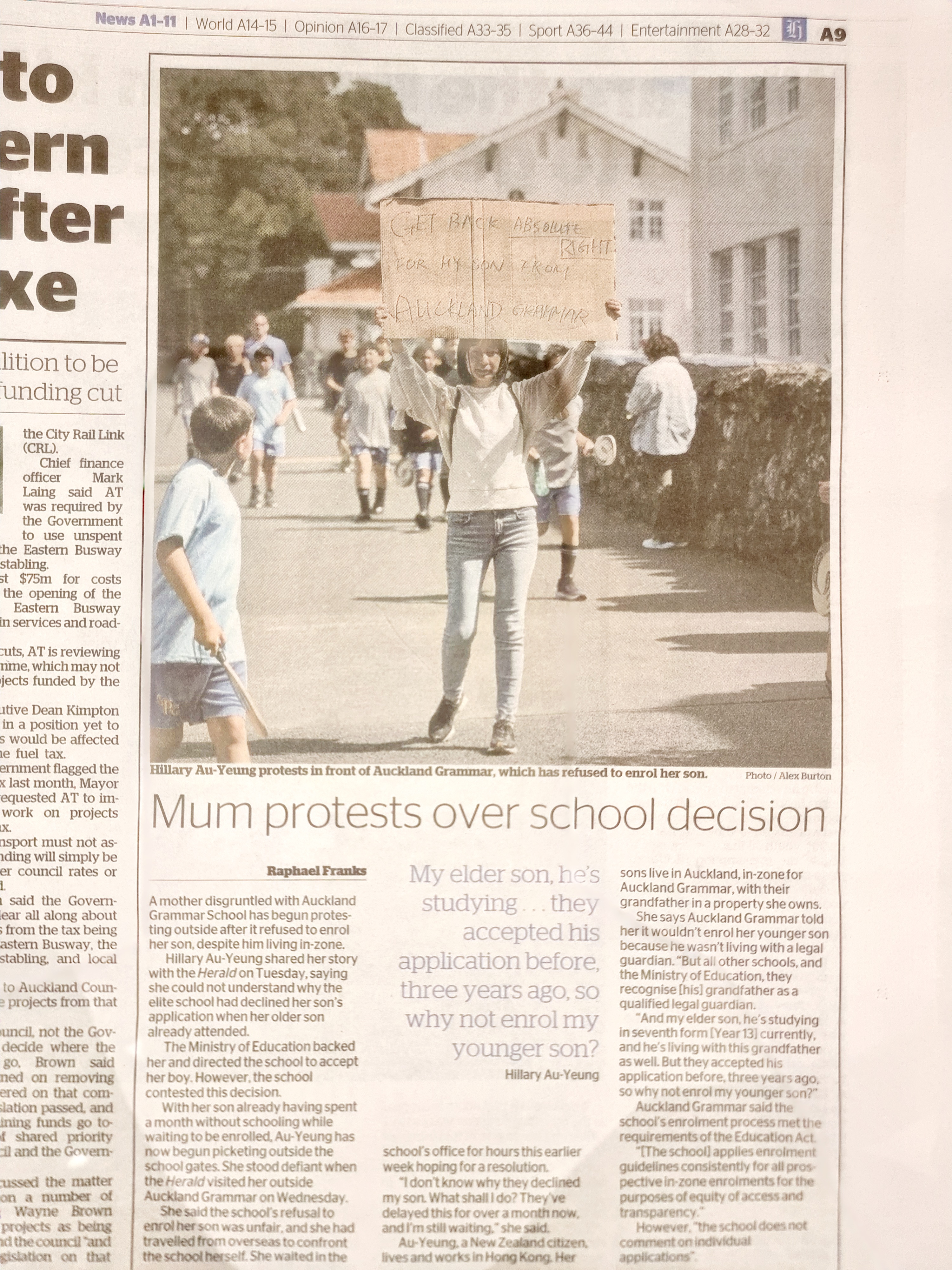 어제 신문을 보다가 낯설지 않은 광경의 기사가 보였다. 오클랜드 그레마스쿨(고등학교)에 입학허가를 받지 못한 학생의 엄마가 1인 시위를 하는 사진과 기사 내용이었다.