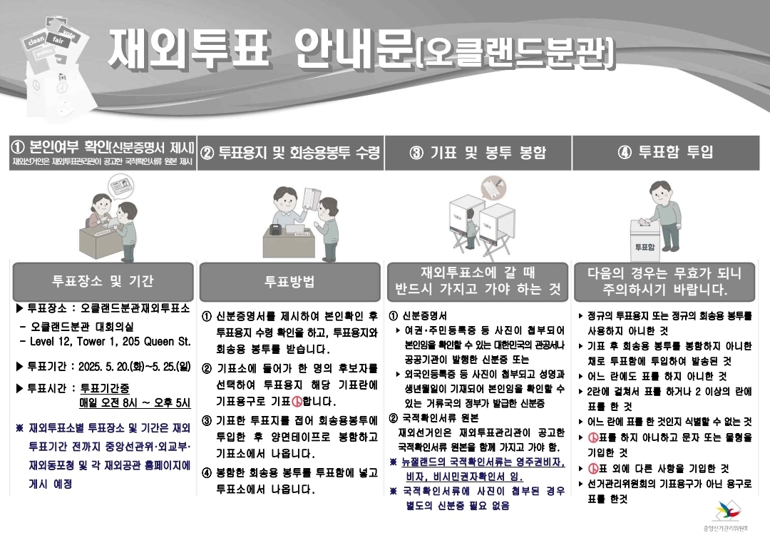뉴질랜드에서는 5월 20일부터 5일동안 재외국민 투표가 진행된다. 나와 아내도 일찌감치 재외국인투표 신청을 했고, 영사관에서 투표안내 이메일과 중앙선거관리위원회에서 투표 관련 이메일을 받았다.