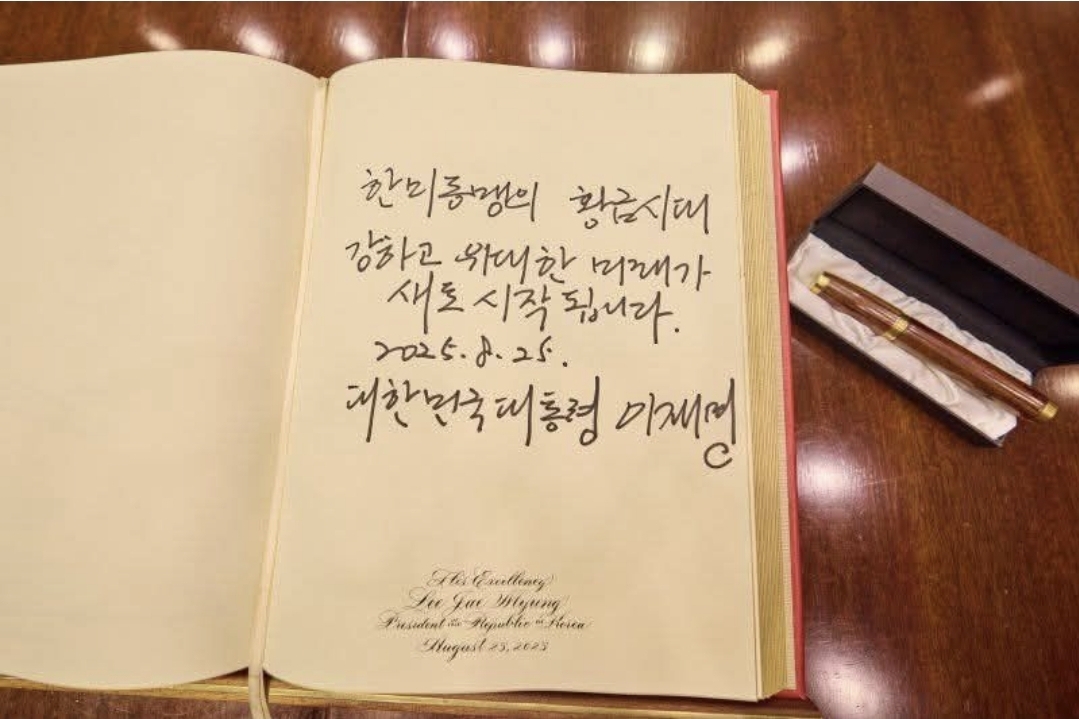 백악관 방문에 우리 대통령이 남긴 방명록 문구다. 내용도 좋지만 써놓은 글씨 자체가 예술이다. 자신감이다.