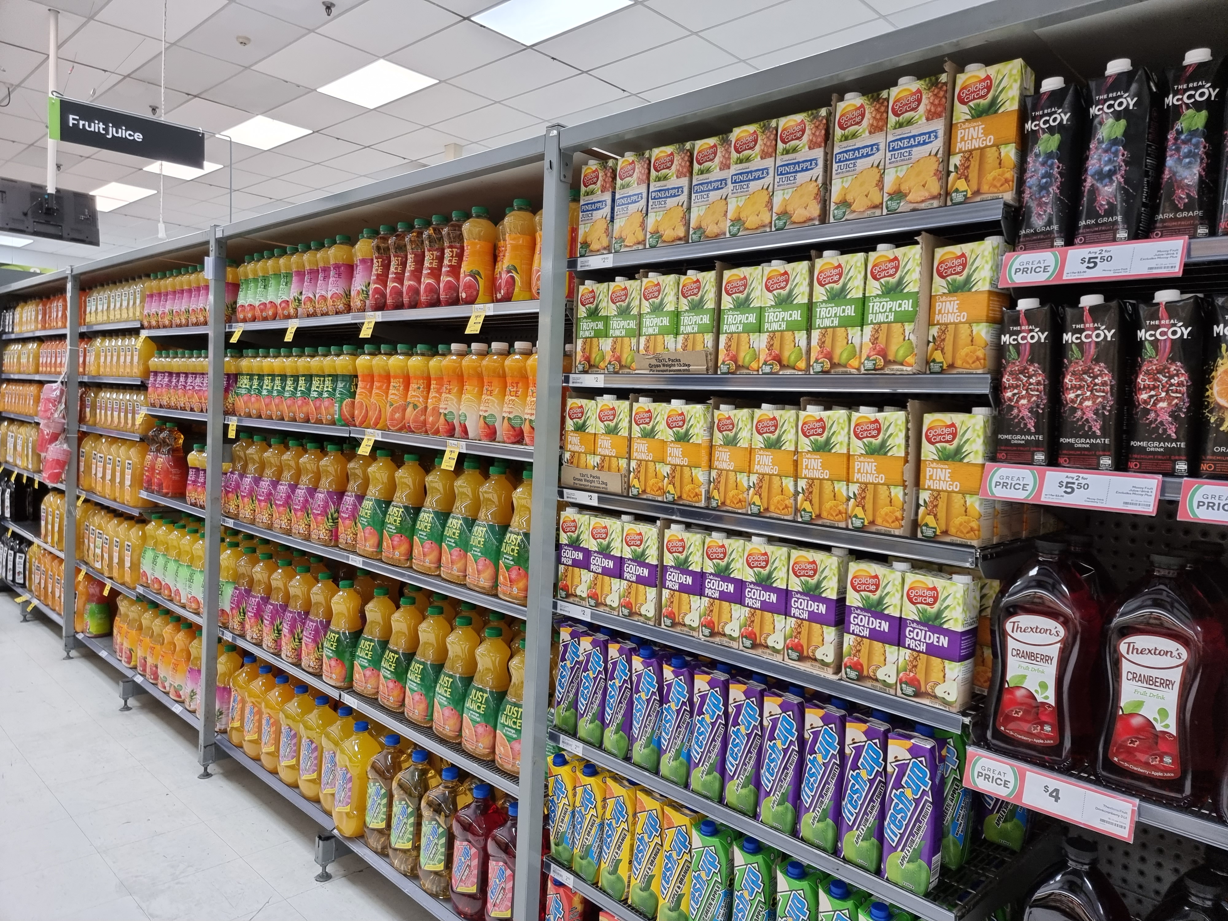오늘 아침 간단히 쇼핑한 아침식사와 간식거리 목록을 올려본다. 그리고 밤새 물건을 꽉 채워 넣은 슈퍼마켓 진열의 싱싱한 모습이다. 이것도 오전이 끝나갈 때쯤이면 텅 비게 될 것이다.