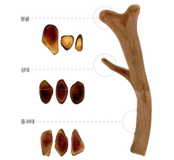 녹용은 사슴뿔의 부위에 따라 팁, 분골, 상대, 중대, 하대로 나뉘어 집니다. 상단부분의 녹용일수록 영양소가 풍부하여 어린이나 청소년들에게 많이 이용됩니다. 하단부분의 녹용 또한 상단부분의 녹용과는 다른 영양소가 풍부하여 각 부위별 효능을 알고 선택하시는 것이 좋습니다.