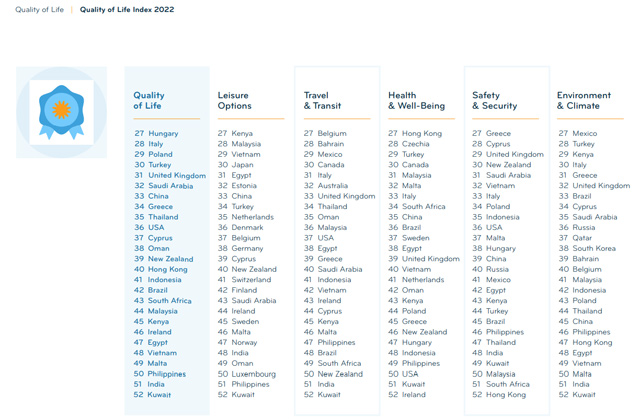 주거(집 얻기)는 51위(52개국 중), 정착 편의성 34위, 외국인을 환대하는 문화 37위, 주민들의 친절함 30위, 친구 사귀기 35위, 직장 전망 46위, 일과 여가의 균형 41위, 임금과 직업 안정성 45위, 직장 문화와 만족도 26위, 디지털 생활 19위, 비자 발급/은행 계좌 열기 등의 관청 업무에서는 17위, 언어는 16위입니다.