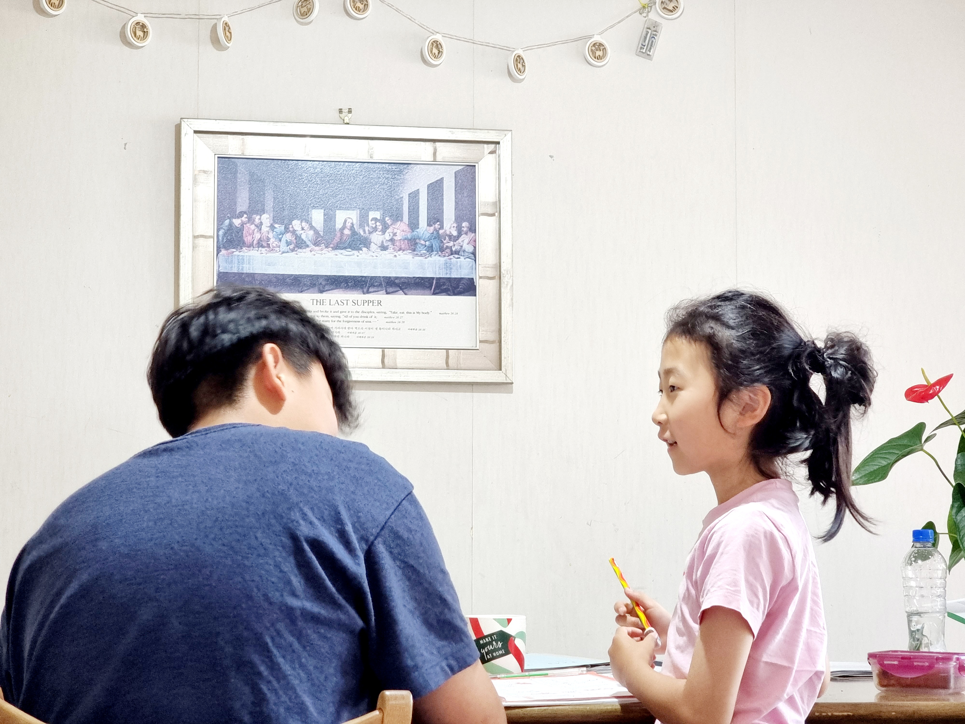 다래는 오빠가 옆에서 가르쳐 주는 것만으로도 재미있는지 틀리든 맞든 즐거운 기분으로 시간을 보내고 있습니다. 아무래도 다민이는 수학을 잘하고, 반대로 다래는 영어는 잘 따라가는데 수학은 원하는 만큼 잘 안 되는 것 같습니다.