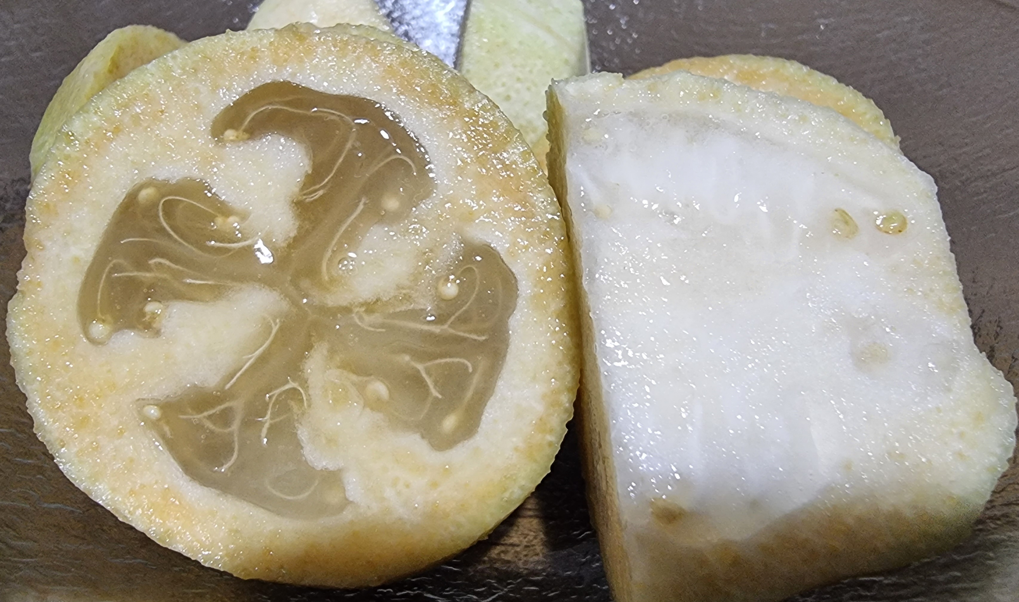 열매는 껍질을 깎아놓고 보면 반투명 중심부에는 씨가 들어 있으며, 크리미 한 하얀 과육의 알갱이 질감과 특유의 향기는 왜 파인애플 구아바라는 별칭이 생겼는지 설명해 주고도 남습니다. 피조아는 모과처럼 몇 개망 방안에 놓아두어도 방 전체에 향이 퍼질 정도로 강한 향을 지니고 있습니다.