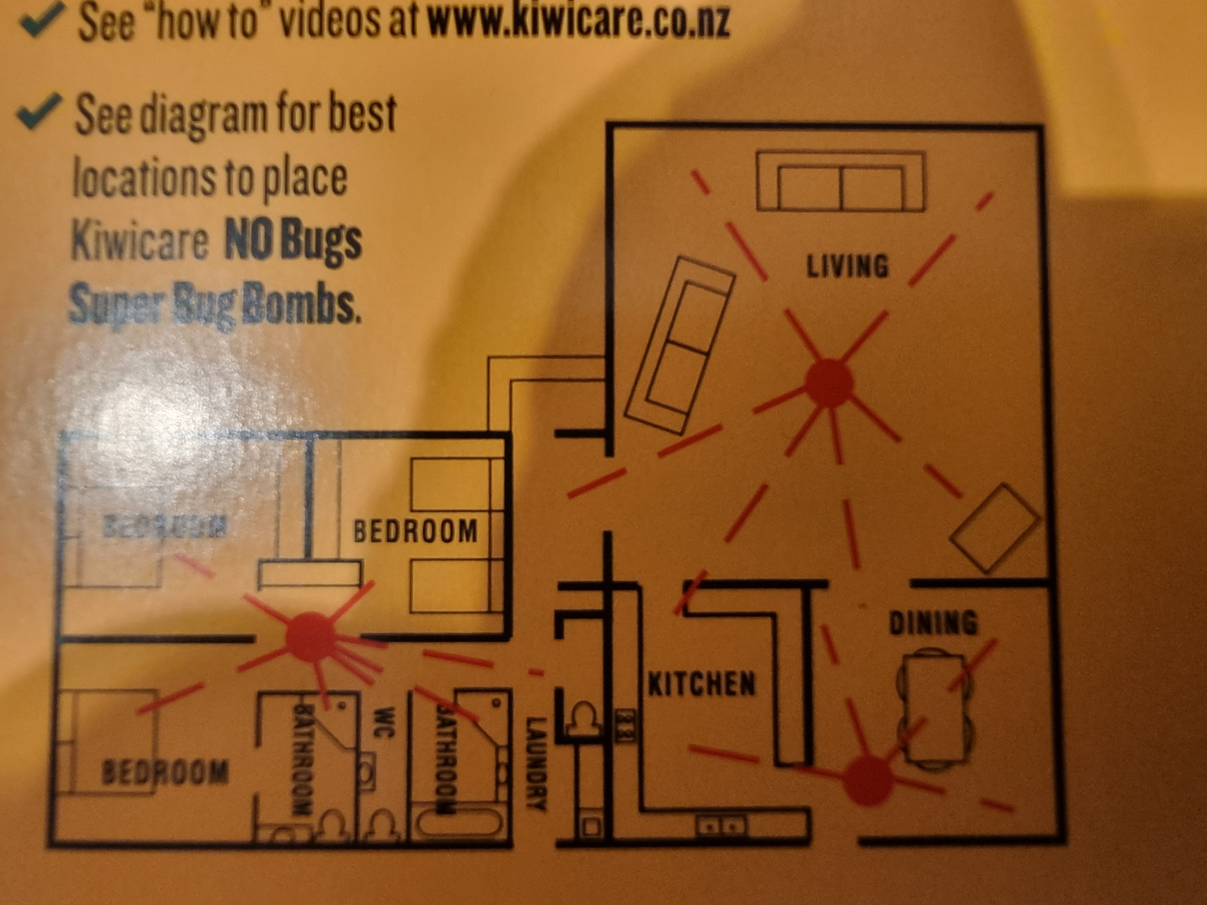 그리고 벼룩이나 빈대에 침투당한 곳에서 '폭탄'을 투하합니다. 이곳 뉴질랜드에서는 쉽고 확실하게 처리하는 방법 중 한 가지입니다.