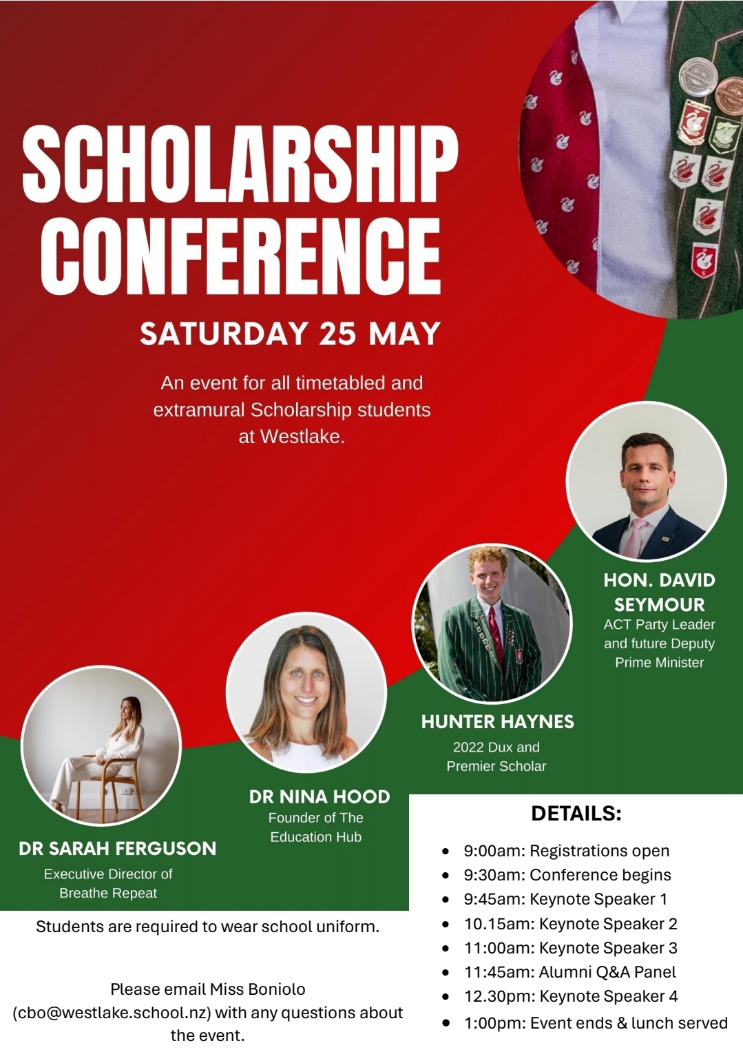 The event is free for students to attend. Students are required to wear their school uniform. The general outline for the day is as follows: