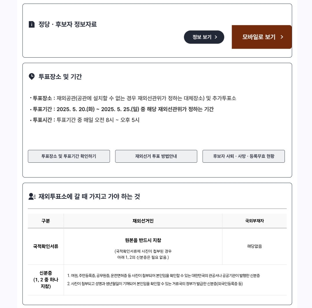 1번 후보 홍보물에는 오롯이 재외국민을 향한 내용들이고, 2번 후보 홍보물에는 재외국인에 관련된 내용이 하나도 없다. ㅜㅜ 물론 디테일로 들어가 보며 몇 가지라도 해당되는 게 있을 수도 있겠으나 뭔가 씁쓸함이 느껴진다.